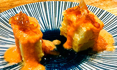 Chipirón con Huevo de Corral, guanciale, siitake, cebolla y