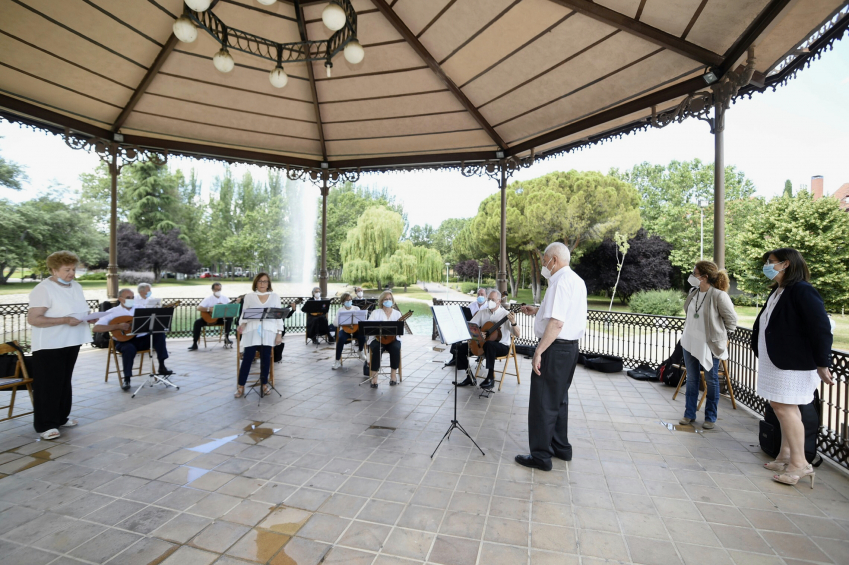 La Orquesta de Pulso y Púa “Entre Amigos” de los centros municipales de mayores de Pozuelo de Alarcón ha celebrado hoy su particular y excepcional actuación de fin de curso. Para ello, un total de 13 componentes se han reunido en el Templete del Parque de Las Minas, para interpretar una pieza musical que se ha grabado y que formará parte de la serie de videos que los integrantes de los grupos culturales de los centros municipales de mayores han ido grabando en este confinamiento y que se pueden ver en la sección “Mayores de Pozuelo No Stop” en la web municipal.